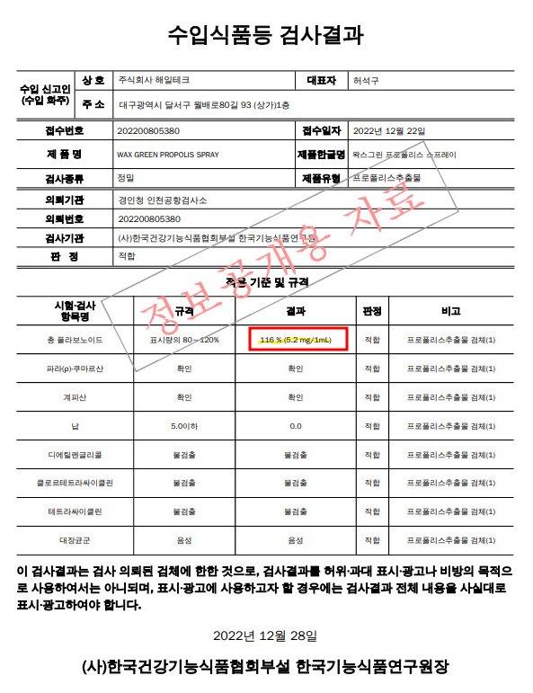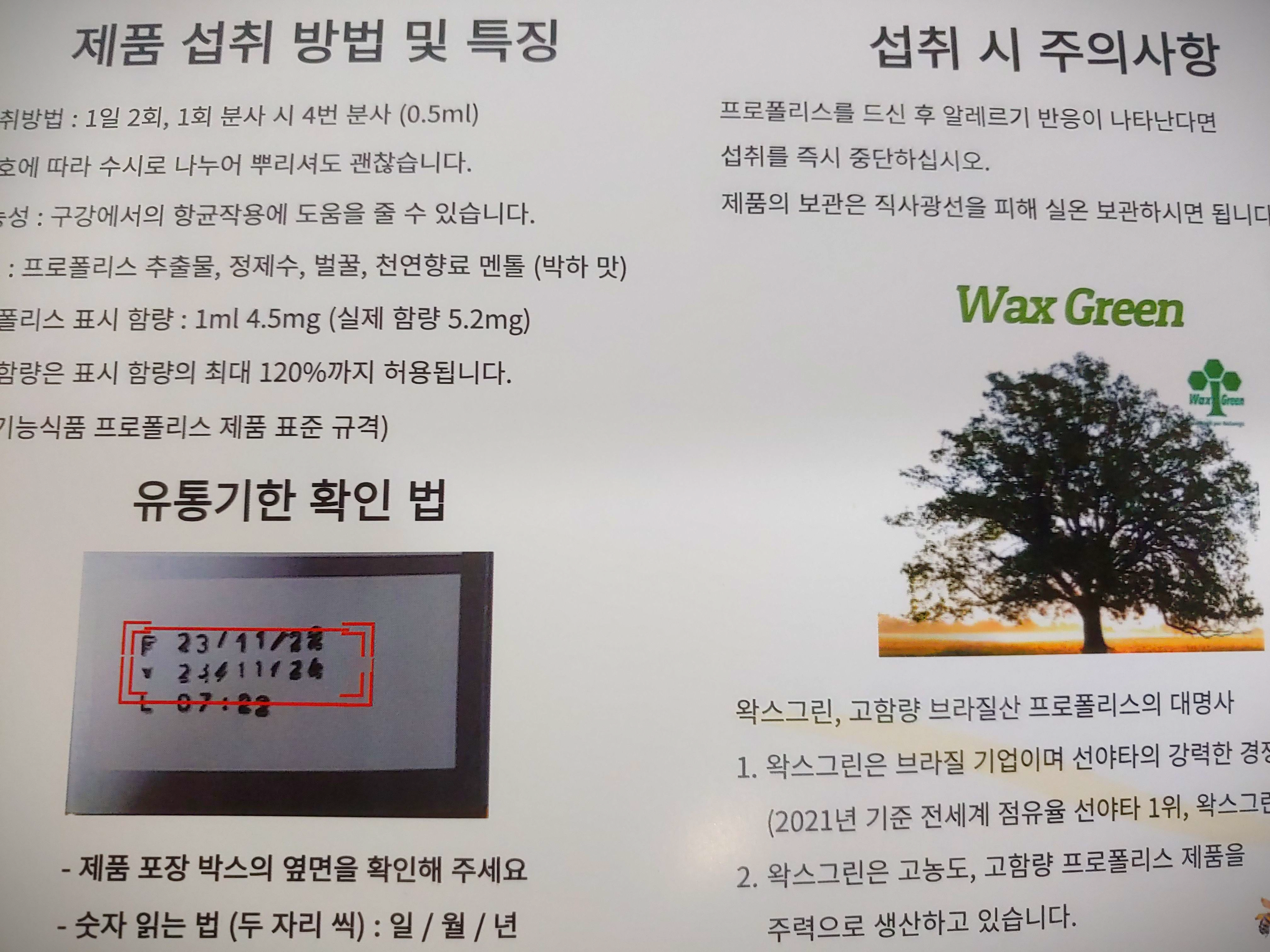 Wax Green 왁스그린 프로폴리스 스프레이는 1ml 에 기능성 성분 플라보노이드 함량이 4.5mg입니다. 그리고 표시는 이렇게 되어 있지만 실제 수입 시 검사 결과는 5.2mg입니다.