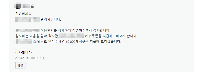 5월에 포스팅한 글인데 6월 중순쯤 이렇게 쿠폰을 준다는 댓글을 다셨습니다. 의도치 않게 서로 돕는 상생 관계를 이룬 셈이죠.